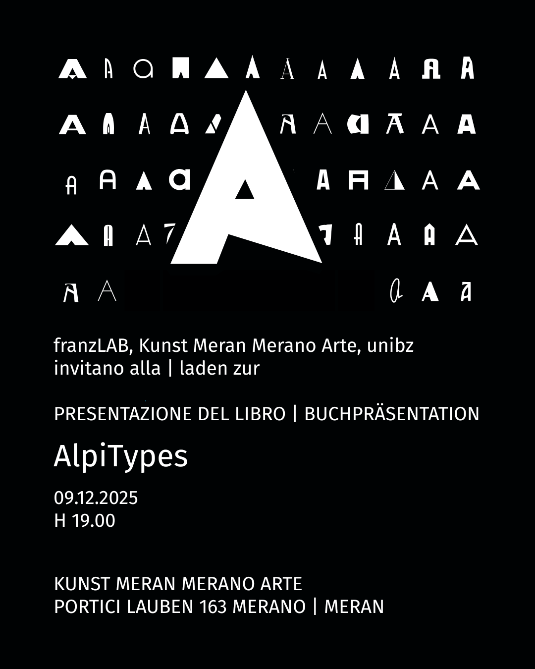 Das Buch AlpiTypes. Von historischen Lettern zu digitalen Fonts. Südtirol, Tirol, Trentino. Grafische Wege 1900–1945 und darüber hinaus, entwickelt von Antonino Benincasa, Massimo Martignoni und Kunst Meran Merano Arte und veröffentlicht im Verlag franzLAB, ist das Ergebnis eines Forschungsprojekts, das historische Analyse, gestalterische Praxis und didaktische Experimente auf exemplarische Weise miteinander verbindet.