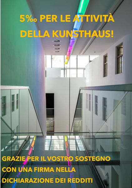 Il 5 per mille non è una spesa, ma una diversa destinazione di una parte delle tasse che si pagano. Quando compilerà la denuncia dei redditi, nello spazio sotto la firma indichi il nostro codice Kunst Meran – Merano Arte 01596020212.