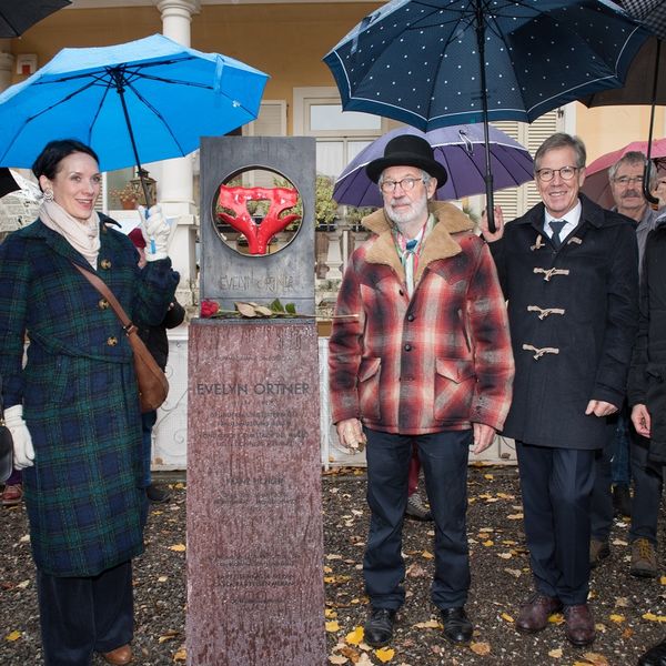 Il ritratto di Evelyn Ortner, nonostante un approccio figurativo, non si pone come una rappresentazione della donna quanto piuttosto come una metafora della sua variopinta personalità, anche grazie al suo taglio leggermente astratto. A prima vista la forma proposta può sembrare un cuore, ma a un’analisi più attenta emerge un paio di scarpe rosse. Franz Pichler, che è stato amico di lunga data di Evelyn Ortner, propone volutamente un parallelismo tra la sua passione per il collezionismo di scarpe da donna stravaganti e la campagna "Zapatos Rojos" avviata a Ciudad Juárez (Messico) nel 2009. Questo progetto è riproposto ogni 8 marzo, in occasione della Giornata della Donna, in diverse località di tutto il mondo. Centinaia di scarpe rosse nelle strade e nelle piazze non solo rappresentano la presenza del genere femminile nello spazio pubblico, ma fungono anche da richiamo visivo delle numerose violenze sulle donne e dei frequenti femminicidi che caratterizzano società di stampo patriarcale. In questo modo, Pichler collega in modo espressivo la predilezione di Ortner per le scarpe e il suo importante lavoro per la femminilità con una tematica sociale di grande complessità.